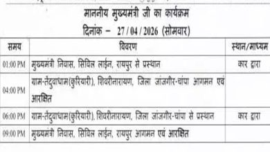 रायपुर :- मुख्यमंत्री विष्णुदेव साय सोमवार को जांजगीर-चांपा जिले के प्रवास पर रहेंगे। तय कार्यक्रम के अनुसार वे दोपहर करीब…