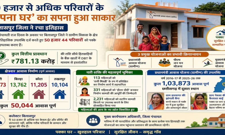 राष्ट्रीय पंचायती राज दिवस के अवसर पर बिलासपुर जिले ने ग्रामीण विकास के क्षेत्र में एक ऐतिहासिक उपलब्धि दर्ज करते हुए 50 हजार 44 परिवारों को पक्के आवास उपलब्ध कराए हैं। जिला प्रशासन द्वारा योजनाओं के क्रियान्वयन में पारदर्शिता और समयबद्धता को सर्वाेच्च प्राथमिकता दी गई। कुल 781.13 करोड़ रुपये की राशि सीधे हितग्राहियों के बैंक खातों में डीबीटी के माध्यम से हस्तांतरित की गई, जिससे बिचौलियों की भूमिका समाप्त हुई और कार्यों में तेजी आई।