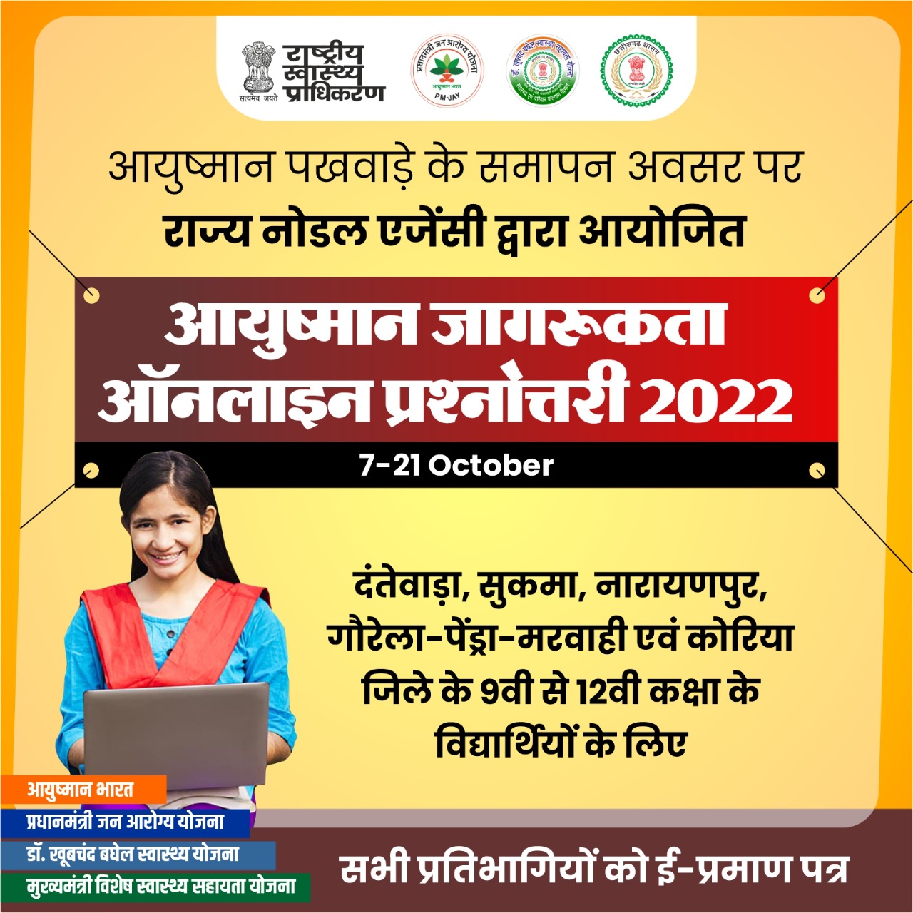 दंतेवाड़ा। दक्षिण बस्तर दंतेवाड़ा जिले में राज्य से प्राप्त दिशा निर्देशानुसार आयुष्मान भारत प्रधानमंत्री जन आरोग्य योजना एवं डॉ खूबचंद बघेल स्वास्थ्य सहायता योजना के तहत जिले में आयुष्मान पखवाड़े के समापन पर आयुष्मान जागरूकता ऑनलाइन प्रश्नोत्तरी प्रतियोगिता का आयोजन किया जा रहा है।यह प्रतियोगिता 7 अक्टूबर से 21 अक्टूबर तक होगी जिसमें हायर सेकेंडरी स्कूल में पढ़ने वाले बच्चे शामिल हो सकते हैं। उक्त प्रतियोगिता में वेब पोर्टल के माध्यम से वैकल्पिक प्रश्नों के उत्तर देने होंगे सही जवाब देने वाले को ऑनलाइन सहभागिता प्रमाण पत्र उनके व्हाट्सएप नंबर पर उपलब्ध करा दिया जाएगा।