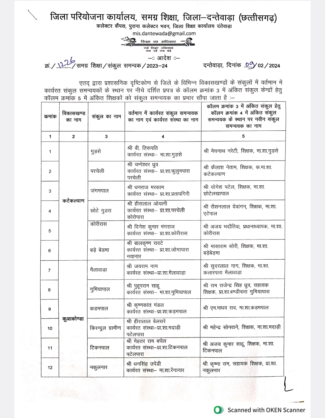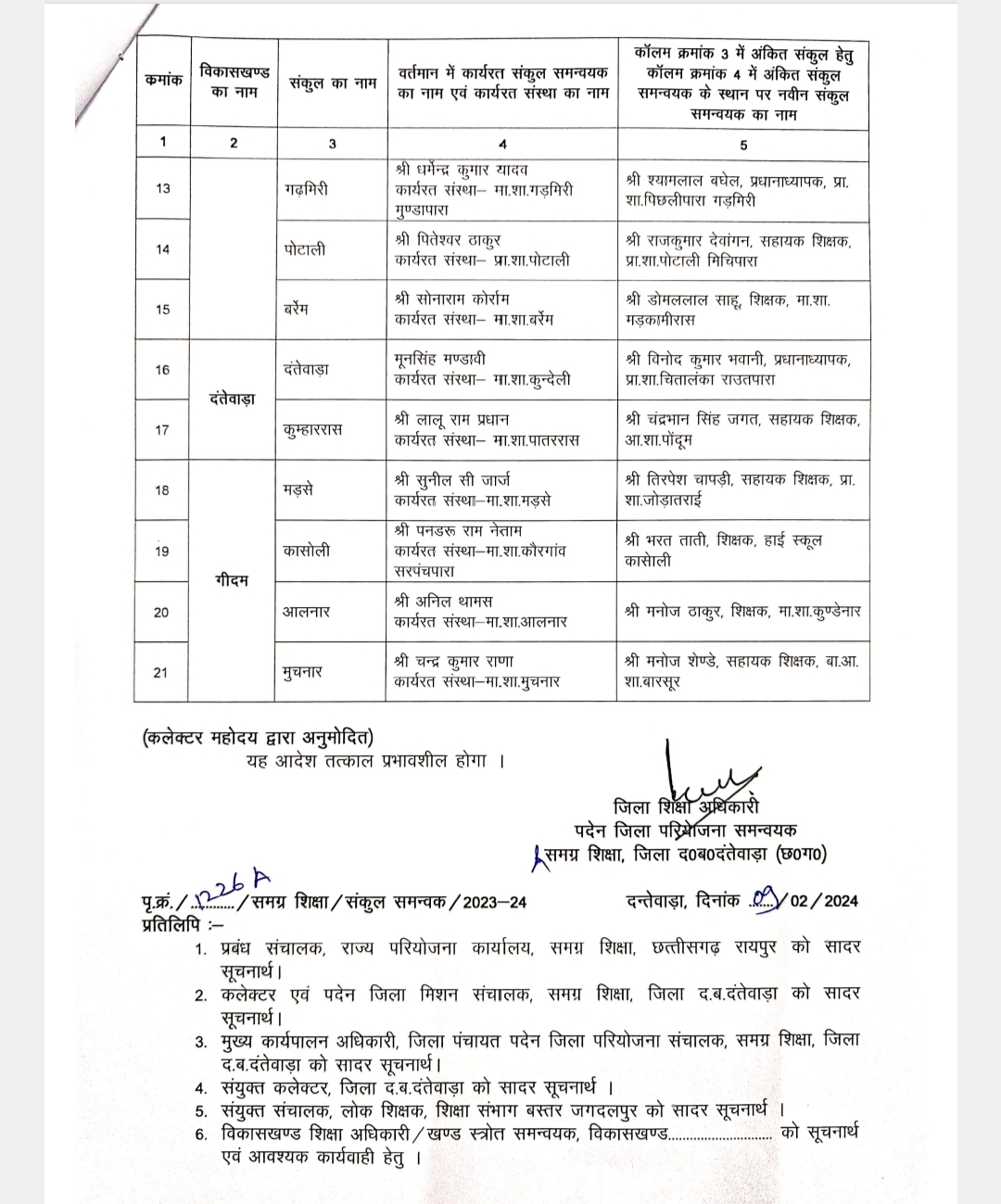 धीरेंद्र तिवारी दंतेवाड़ा। दक्षिण बस्तर दंतेवाड़ा जिले में शिक्षा विभाग में बड़ी सर्जरी हुई है। चारो ब्लॉक में 21 संकुल समन्वयक बदल दिये गए है। जिला शिक्षा अधिकारी राजकुमार कठौते ने यह आदेश जारी किया है। जिले चारो विकासखंड क्रमशः कुआकोंडा में 9, कटेकल्याण में 6, गीदम में 4 एवं दंतेवाड़ा ब्लॉक में 2 संकुल समन्वयक बदले गए है। बदले गए समन्वयक की सूची देखें।