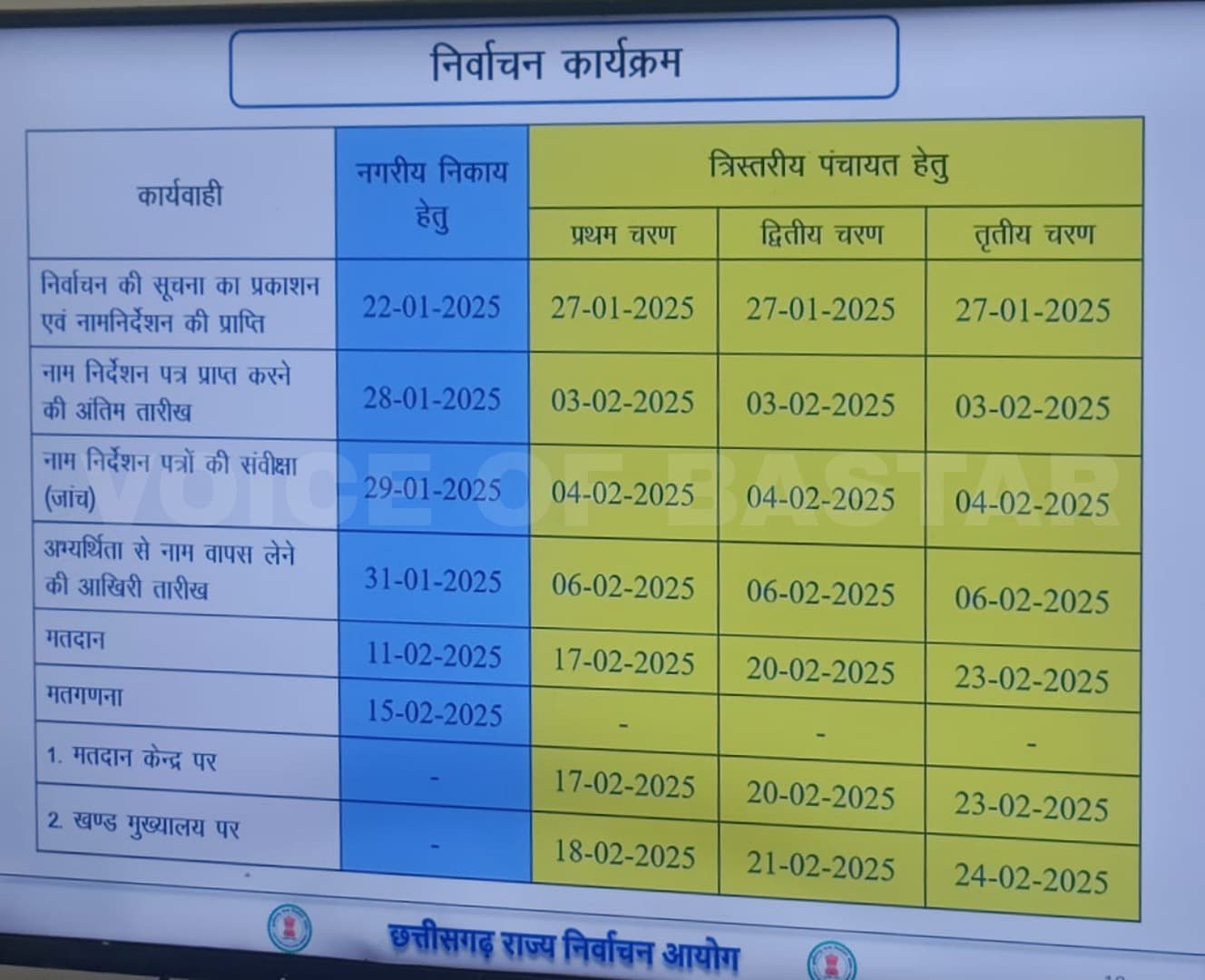 रायपुर। प्रदेश में नगरीय निकाय एवं पंचायत चुनाव के लिए चुनाव आयोग ने किया तारीखों का ऐलान कर दिया है। चुनाव की तारीख ऐलान होने के बाद से ही प्रदेश में आदर्श आचार संहिता लागू हो गई है पूरे प्रदेश में नगरीय निकायों का चुनाव एक चरण में होगा। 11 फरवरी को नगरीय निकायो में के लिए मतदान होंगे। 15 फरवरी को निकाय चुनाव के परिणाम आएंगे इसी कड़ी मे प्रदेश मे त्रि स्तरीय पंचायत चुनाव तीन चरणों में होगा…17, 20, 23 फरवरी को होगा पंचायत चुनाव होगा।