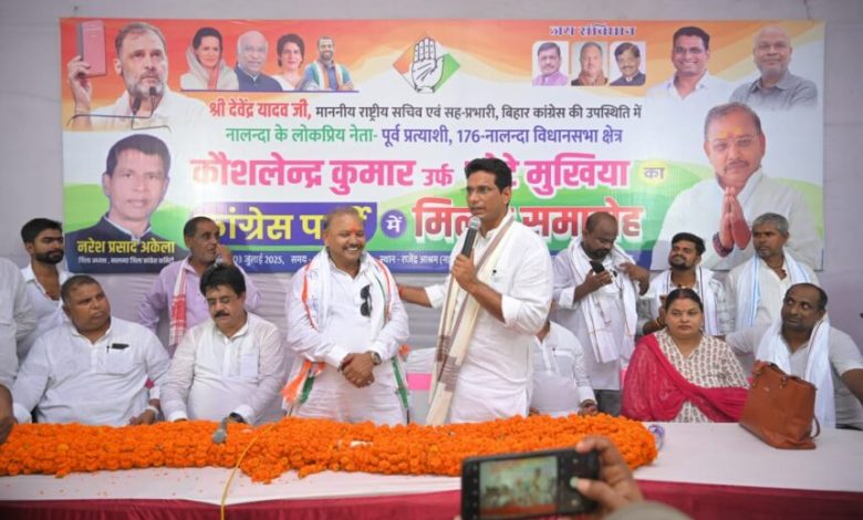 कार्यकर्ताओं को संबोधित करते हुए देवेंद्र यादव ने कहा, ‘यह मिलन समारोह बिहार प्रदेश कांग्रेस कमेटी के अध्यक्ष राजेश राम एवं प्रभारी अल्तावरु जी के मार्गदर्शन में आयोजित किया गया है। इस बार के चुनाव में हम मजबूत उम्मीदवारों के साथ मैदान में उत्तरेंगे। नालंदा से छोटे मुखिया जैसे समर्पित साथी का पार्टी में आना कांग्रेस के लिए सौभाग्य की बात है। हम उन्हें दिल से स्वागत करते है।”