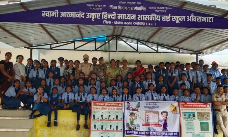 दंतेवाड़ा |जिले के स्वामी आत्मानंद उत्कृष्ट हिंदी माध्यम हाई स्कूल आंवराभांठा में मंगलवार को यातायात पुलिस दंतेवाड़ा एवं महिला सेल द्वारा संयुक्त रूप से जागरूकता अभियान चलाया गया। इस अभियान का उद्देश्य स्कूली बच्चों को यातायात नियमों, महिला सुरक्षा, साइबर फ्रॉड और आत्मरक्षा जैसी महत्वपूर्ण विषयों पर जागरूक करना था।
